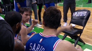 via giphy.com sports, nba, friends, basketball, high five, good job, nba playoffs, sixers, philadelphia 76ers, phi, teammates, player bench, good work, proud of you, t.j. mcconnell, keep up the good work