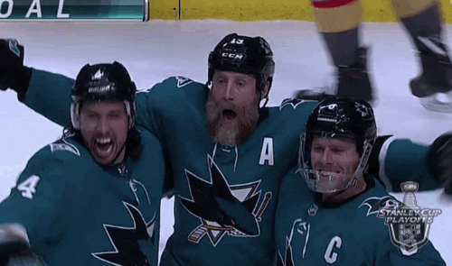 happy, sports, sport, excited, hockey, nhl, 2019, ice hockey, pumped, woo, stanley cup playoffs, hockey hug, goal hug, group hug, san jose sharks, 2019 stanley cup playoffs, joe thornton, sjs, stanley cup playoffs 2019, nil playoffs